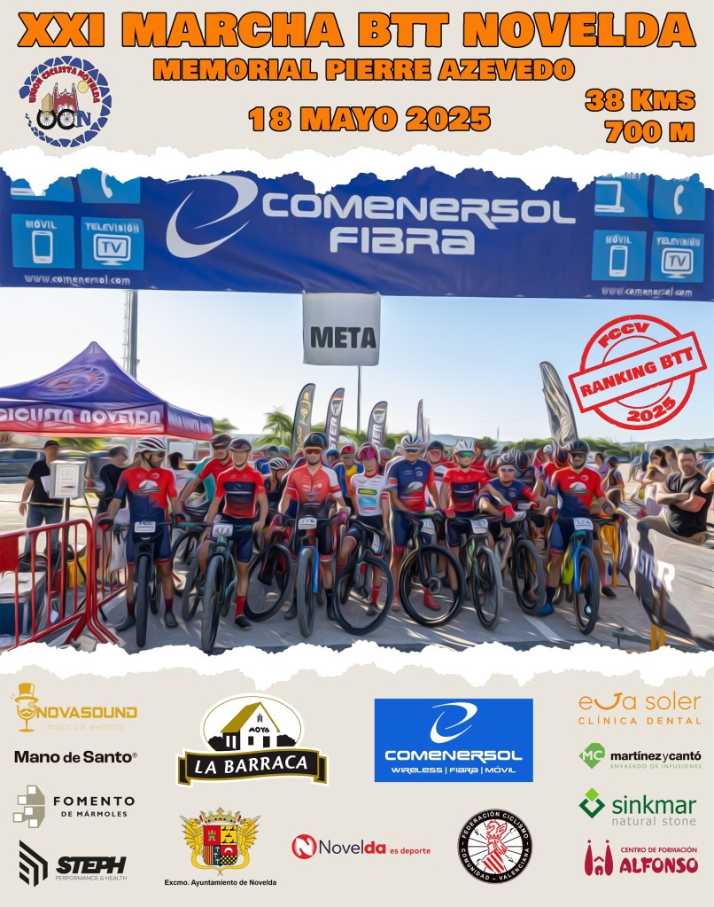 Este domingo, 18 de mayo, se disputa la 21 edición de la ya clásica Marcha BTT Novelda. La salida se dará a las 9.30 horas desde el Velódromo Luis Navarro Amorós de nuestra localidad. La marcha se encuentra dentro del circuito de cicloturismo de la FCCV, y será puntuable para el ranking de ciclourismo BTT. Serán 38 kilómetros de recorrido y un desnivel positivo de 700 metros. Organiza la prueba la Unión Ciclista Novelda.