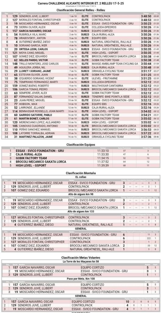Llibert Sendros -primero- y Christopher Morales -segundo- le dan un día de gloria al ControlPack en Relleu, en la segunda etapa de la Challenge Alicante Interior. Tercera plaza para Óscar Moscardó (Essax) y quinta de Óscar García (Cortizo). Marc Rubirola (Filial Caja Rural Alea). En la jornada de hoy, Óscar García (Cortizo) ha sido quinto y primer Sub 23 y se ha adjudicado las Metas Volantes. Óscar Moscardó (Essax), la Montaña. El Essax Svico Foundation ha sido la mejor escuadra.