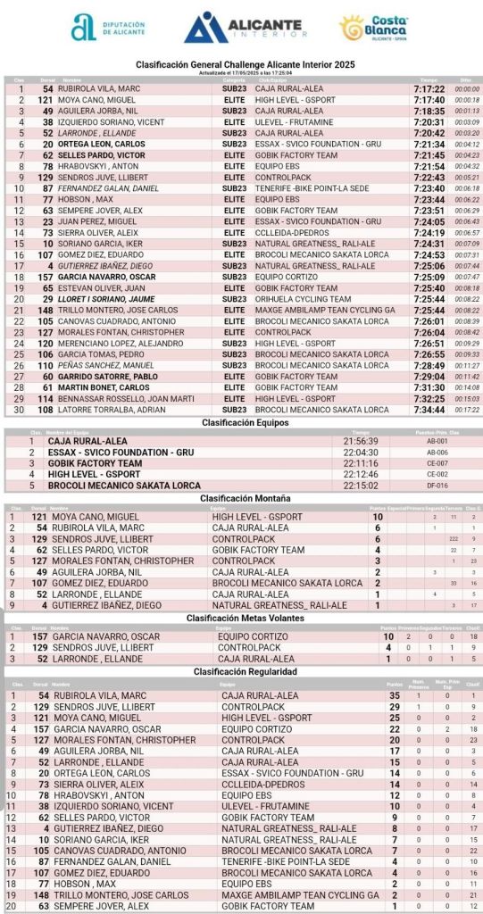 La general de la Challenge sigue encabezada por Marc Rubirola (Filial Caja Rural Alea), con Miguel Moya (High Level Gsport), segundo, y, Nil Aguilera (Filial Caja Rural Alea), tercero. Rubirola domina también la Regularidad; Moya, la Montaña; Óscar García, las Metas Volantes; y filial del Caja Rural es el mejor conjunto. AVANCE