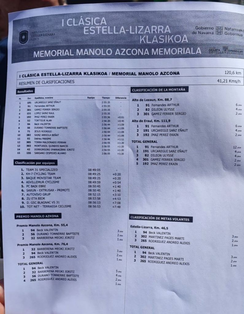 Eñaut Urkaregui (Tolosa) se ha impuesto hoy en la primera edición de Clásica Estella-Memorial Manolo Azcona para corredores júnior que ha tenido carácter internacional. Arthur Fernandes (Specialized) ha sido segundo y Sergio Gámez, tercero. Puesto 15 para Álvaro Sansano (Baqué).