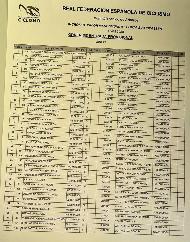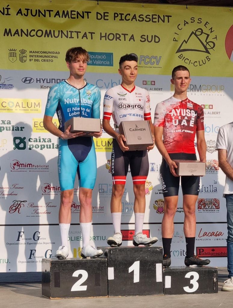 En la General del Torneo Júnior, Alejandro García, del Saxun Extrusax Primoti, es el nuevo líder. Luis Bernabéu (DqAgro Cartagena) perdió el amarillo tras sufrir una caída a 10 kilómetros de meta. Aitor Arlandis (Ayuso Team) comanda el premio de la Montaña y Pau Salvador (Ayuso Team), las MV.