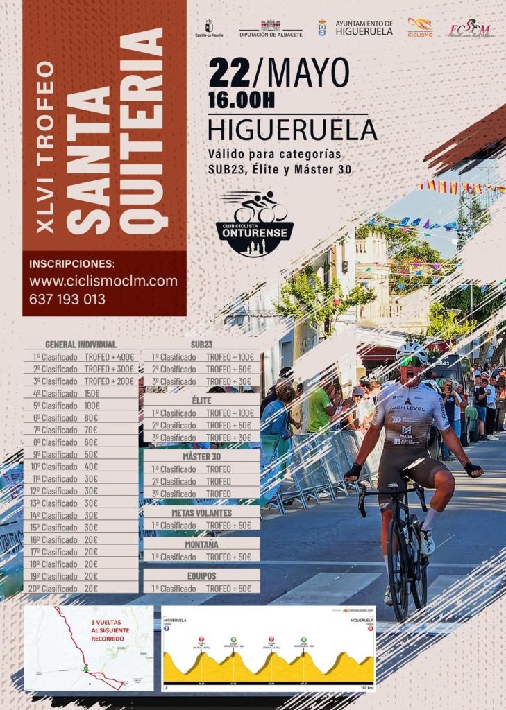 Hoy se disputa en Higueruela la 46º edición del Trofeo Santa Quiteria, para corredores Élite, Sub 23 y M30, sobre 159 kilómetros, por la carreta de Bonete y Pozo Lorente, con el Alto de Higueruela entre ambos puntos. Buscando sustituto a Jordi Artigues, ganador en el 2024. Desde las 16:00h en marcha y con la aparicion del viento como principal protagonista.