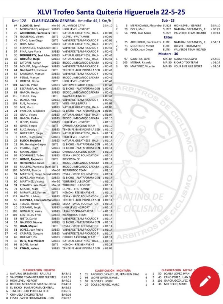 Jordi Slootjes (Aluminios Cayvi) gana en Higueruela el XLVI el Trofeo Santa Quiteria. Alejandro Merenciano (High Level-Gsport) ha sido segundo y Franklin Archibold (Natural Greatness). Archibold se ha llevado la Montaña e Iván Loaisa las Metas Volantes. El Natural Greatness-Rali Alé ha sido la mejor formación.