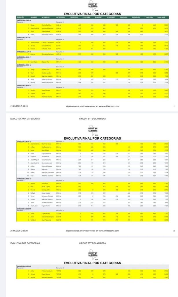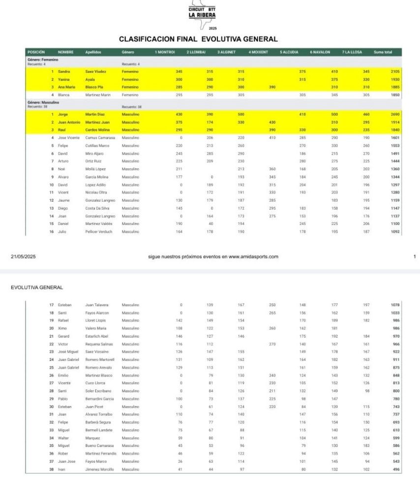-18 de mayo: Llosa de Ranes. Clasificaciones