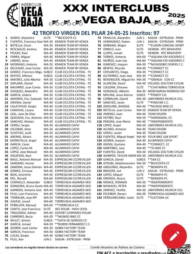El sábado, día 24 de mayo, se disputa en Horadada el 42 Trofeo Virgen del Pilar, prueba puntuable para el Interclubs Vega Baja. La lista de inscritos para dicha prueba alcanza los 97 ciclistas.
