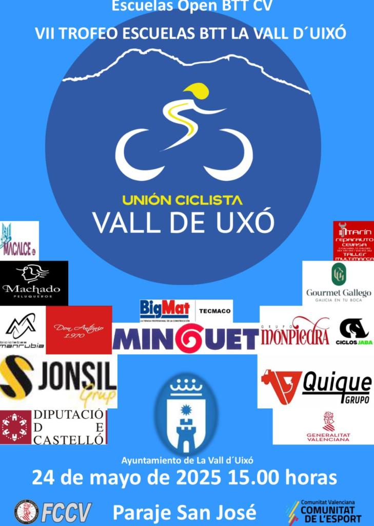 Hoy se disputa, a partir de las 15 horas, VII Trofeo Escuelas BTT La Vall d’Uixó, prueba puntuable para el Open BTT de Escuelas de la Comunidad. La competición se desarrollará en el Paraje San José. Lideran el Torneo, Elía Ruiz (Big Bikes) y Héctor Gil (Cabedo), en Alevines 1; Vega Morales (AM Sonido) e Iker Hiraldo (Sabater), en Alevines 2; Tehya García (Guti Vinalesa) y Javier Delegido (Sabater), en Infantiles 1; y Ainhoa Cano (AM Sonido) y Marc Cano (La Vila), en Infantiles 2.