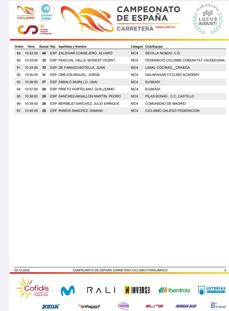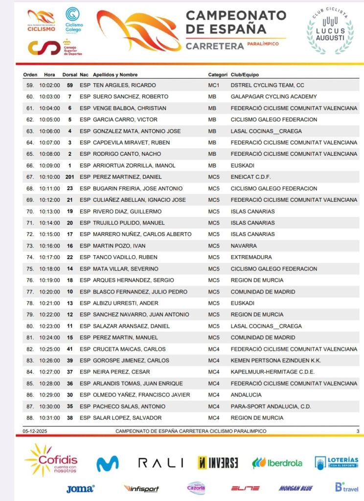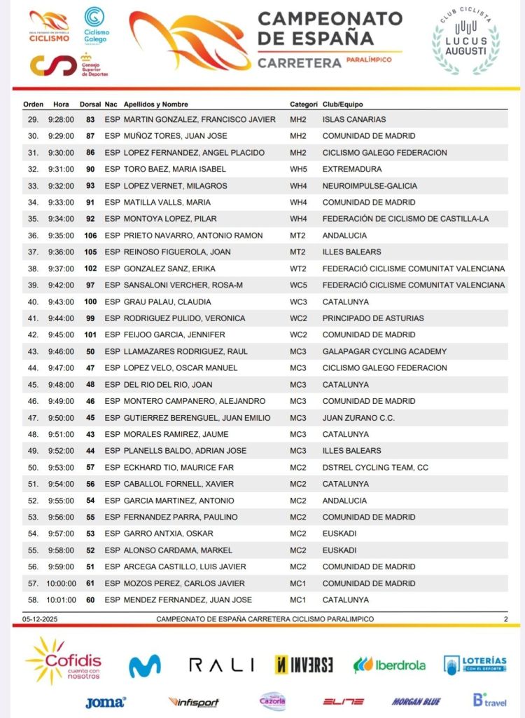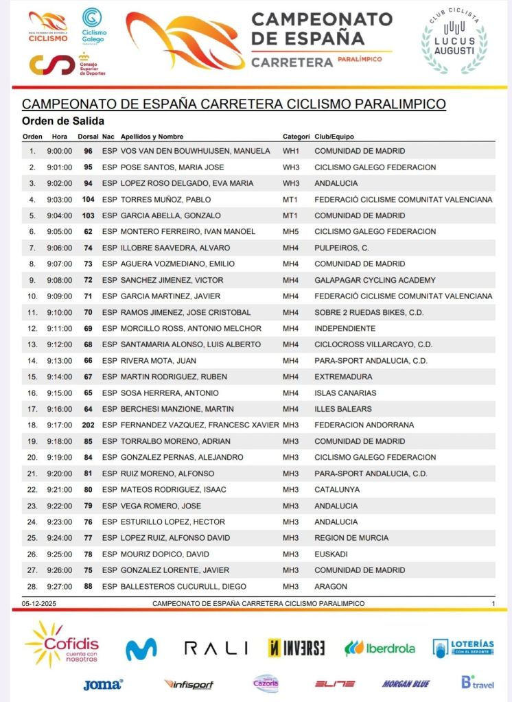 El sábado, desde las 9:00 horas, tendrán lugar las pruebas contrarreloj, que se desarrollarán sobre un trazado de 9,4 kilómetros en el caso de las clases MH1, WH1, WH2, WH3, MT1 y WT1, de 18,8 kilómetros para las clases MH2, MH3, MH4, MH5, WH4, WH5, MT2, WT2, WC1, WC2, WC3, WC4, WC5, MC1, MC2 y MC3. Por último, las clases MC4, MC5, WB, MB y sordos tendrán que recorrer 28,3 km.