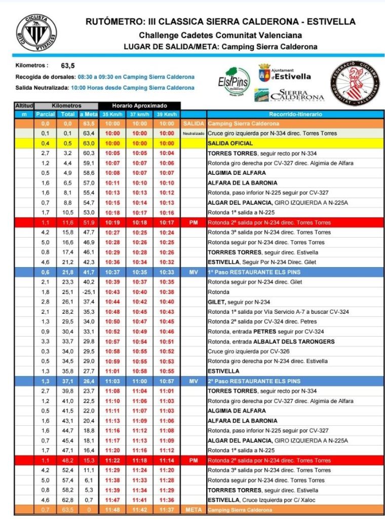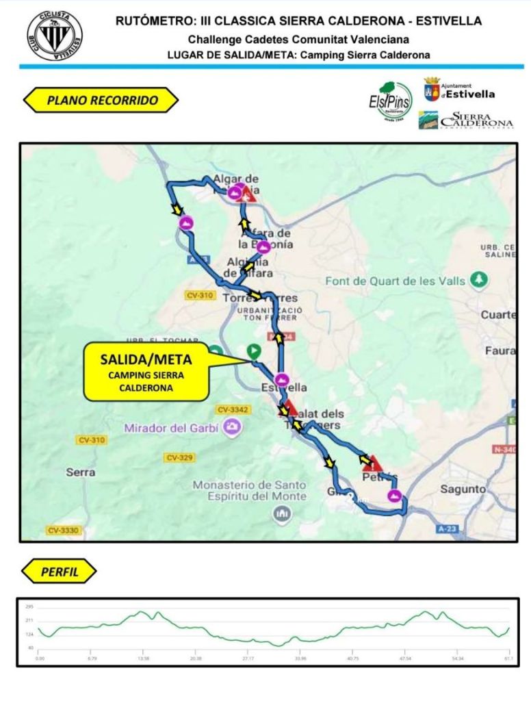 Hoy sábado se disputa en Estivella la III Clàssica Sierra Calderona, prueba puntuable para la Challenge Cadete de la Comunidad Valenciana. La salida se dará a las 10 horas y el pelotón tendrá por delante 63,6 kilómetros de recorrido. Vicent Andrés llega como líder del Torneo y Fran Gramage comanda las Metas Volantes.