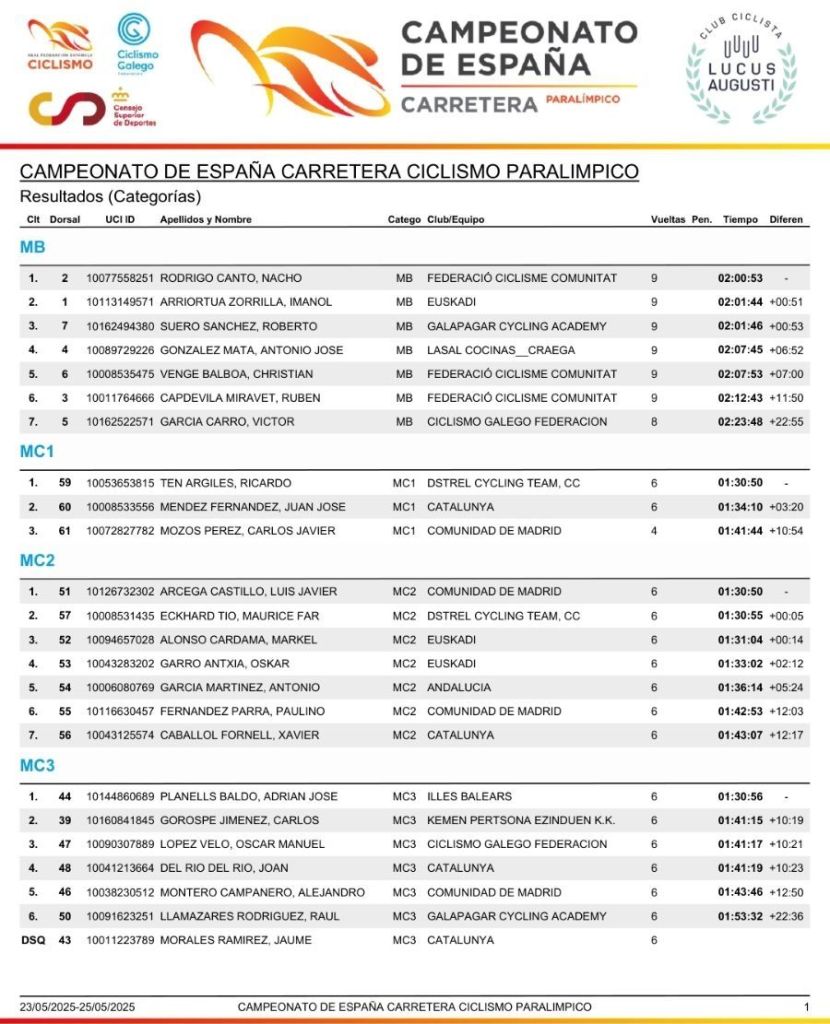 Hoy se se ha puesto en Frigol el punto y final al Campeonato de España de Ciclismo Paralímpico en Carretera con las carreras de ruta. Nacho Rodrigo (FCCV) ha vuelto a colgarse la medalla de oro en MB y también han logrado el título nacional en ruta Ricardo Ten (Dstrel Cycling Team), en MC1; Rosa Sansaloni (FCCV), en WC5; y Erika González (FCCV), en WT2. Además, Maurice Far Eckhard (Dstrel Cycling Team), en MC2, y Pablo Torres (FCCV), en MT1, han conseguido la plata; y Javier García (FCCV), en MH, el bronce.