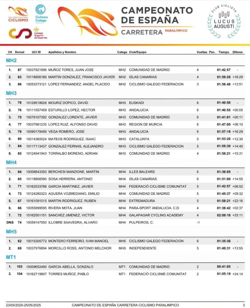 El municipio de Friol (Lugo) ha cerrado la edición 2025 del Campeonato de España de Ciclismo Paralímpico en carretera con la disputa de las pruebas en línea para handbikes, triciclos, bicicletas y tándems. Un bonito día de ciclismo, a pesar del cielo gris que ha acompañado a los corredores, en el que han brillado los grandes nombres del ciclismo paralímpico nacional. La competición se ha desarrollado sobre el mismo trazado de 9,4 kilómetros sobre el que ayer se celebraron las contrarrelojes y donde cada una de las clases ha dado un número de giros adaptado a sus condiciones.