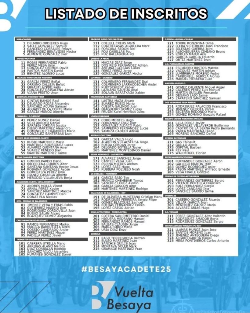 Los equipos Guerola, AZona Elche Team y JuanGiner Ulevel Vitaldinsport disputará este fin de semana la Vuelta al Besaya Cadete 2025 que consta de tres etapas. Al final, el Ikascola, por falta de efectivos, no acude a la cita cántabra. La escuadra de Ontinyent estará en liza con Fran Gramage, Beltrán Raso, Joan Sanchis, Mark Montava e Iván Buleo. Los ilicitanos estarán con Jorge Rueda, Hugo García, Javier Delgado y Dani Navarro.