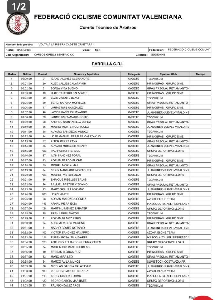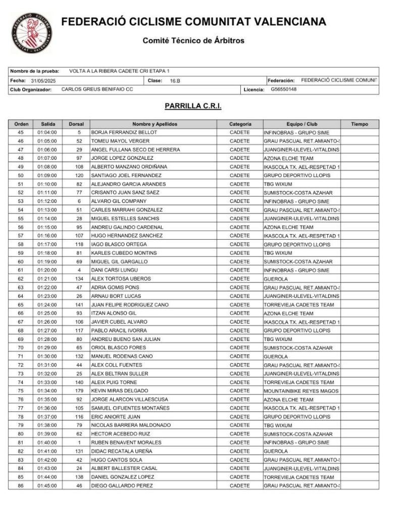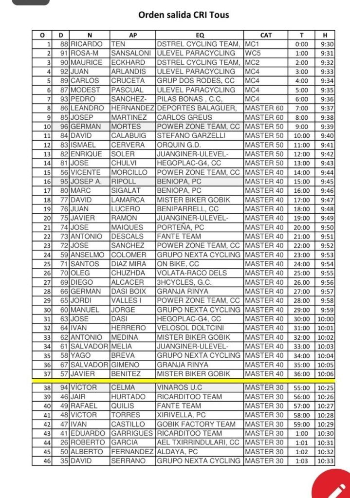 1ª Etapa – Sábado. 31 de mayo. Tous. Cronoescalada al puerto de Tous. Elite y Sub 23, Másters y Paraciclistas (9.30 horas. Inscritos). Cadetes (11.00h. Inscritos).