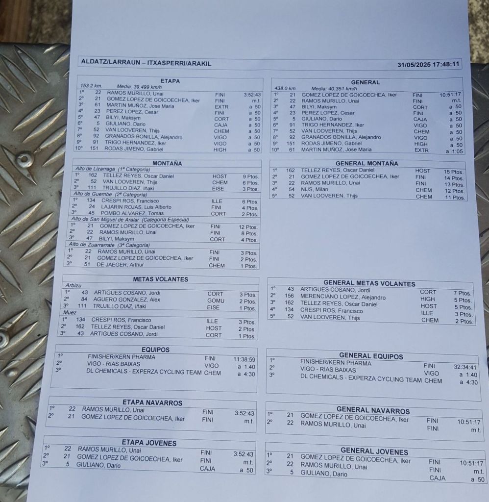Exhibición del Equipo Finisher en la etapa reina de la Vuelta a Navarra, con un doblete de la mano de Unai Ramos e Iker Gómez. Ambos corredores aprovecharon la buena actuación coral a lo largo de la jornada para realizar su apuesta en el último tercio del recorrido. Un resultado que les permite escalar a las dos primeras posiciones en la clasificación general a falta de una jornada.