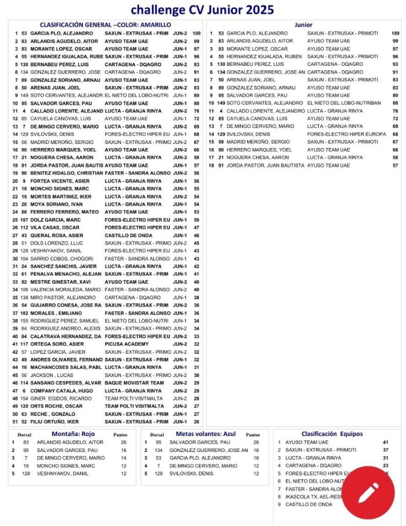 En la General de la Challenge sigue mandando Alejandro García (Saxun Extrusax Primoti) por delante de Aitor Arlandis (Ayuso Team) y de Óscar Morante (Ayuso Team). Arlandis lleva el maillot de líder de la Montaña; Pau Salvador (Ayuso Team), las Metas Volantes; y el Ayuso Team es el mejor equipo.