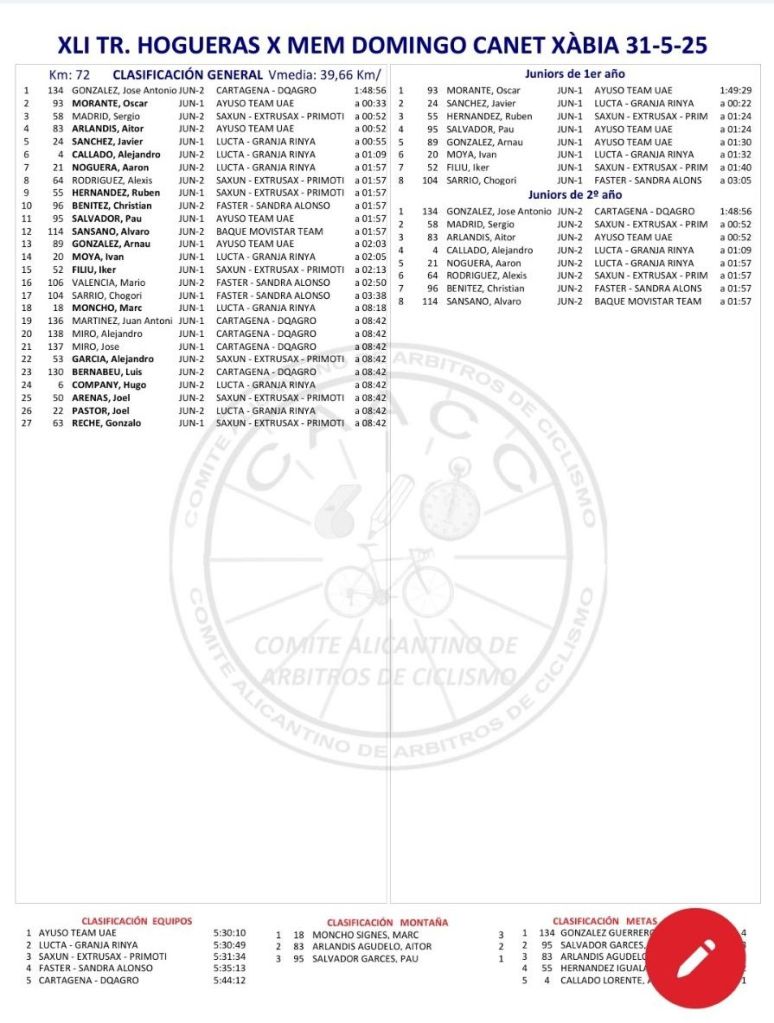 José Antonio González (Cartagena Dqagro) se ha impuesto estas tarde en Xàbia en XLI Trofeo Fogueres de Sant Joan-X Memorial Domingo Canet, prueba puntuable para la Challenge Júnior de Ruta de la Comunidad Valenciana. Óscar Morante (Ayuso Team) y Sergio Madrid (Saxun Extrusax Primoti) han completado el podio de la jornada. Marc Moncho se ha impuesto en el premio de la Montaña; José Antonio González, las Metas Volantes; y el Ayuso Team ha sido la mejor escuadra.