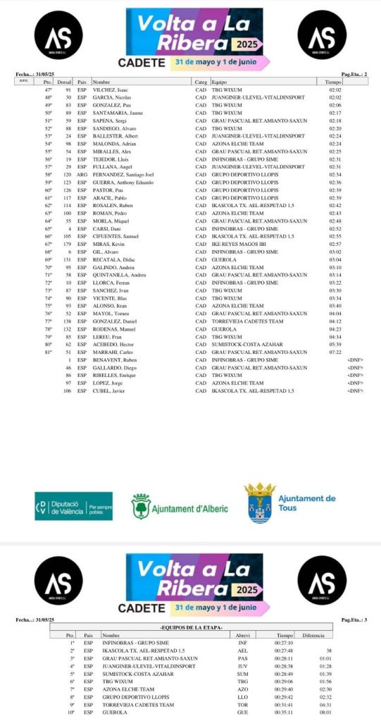 3ª Etapa – Domingo, 1 de junio. Alberic. Circuito con 2 subidas a la Muntanyeta. 60Km. Elite y Sub 23, Másters y Paraciclistas (9.30 horas. Inscritos). Cadetes (11.45h. Inscritos)