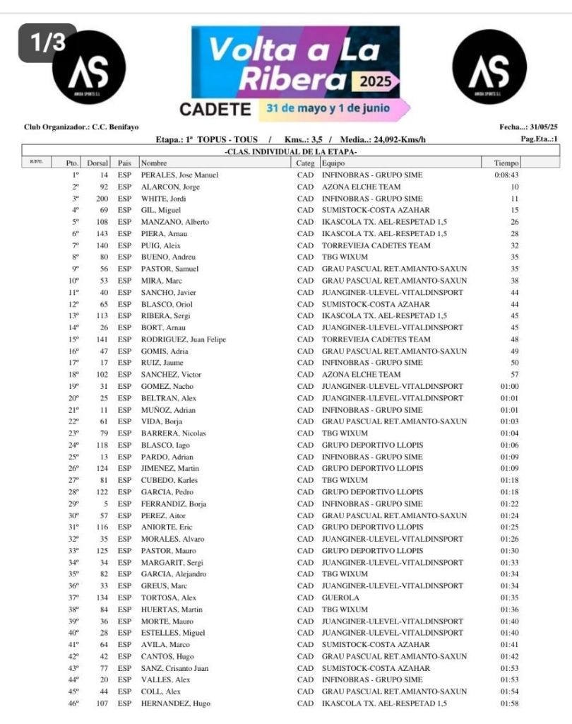 José Manuel Perales (Infinobras Grupo Sime) ha sido el mejor en la categoría cadete. Jorge Alarcón (AZona Elche Team) y Jordi White (Infinobras Grupo Sime) han completado el podio. El Infinobras ha sido la mejor escuadra.