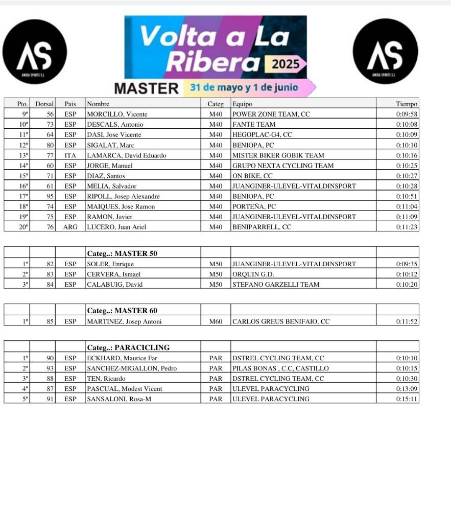 En la categoría Máster 30 la victorias ha sido para David Serrano (Grupo Nexta); José Sánchez (Power Zone Team) ha vencido en en M40; Enrique Soler (JuanGiner), en M50; Josep Antoni Martinez (Carlos Greus), en M60; y Maurice Far Eckhard (Dstrel Cycling Team), en Paraciclismo.