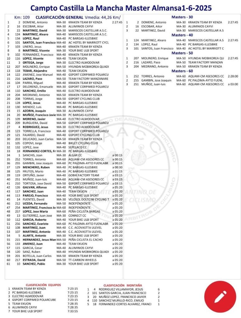 Almansa ha acogido hoy el Campeonato de Castilla La Mancha Máster organizado por la Peña Ciclista El Cacho. Antono Domene (Kraken Team By Kenza) se ha impuesto en eI Trofeo Máster de la localidad manchega que ha contado con 109 kilómetros de recorrido. Antonio Escobar (Aluminios Cayvi) ha sido segundo y David Martínez (Mariscos Castellar), tercero. Jesús Rodríguez se ha llevado la Montaña y el Kraken Team By Kenza ha sido la mejor escuadra.