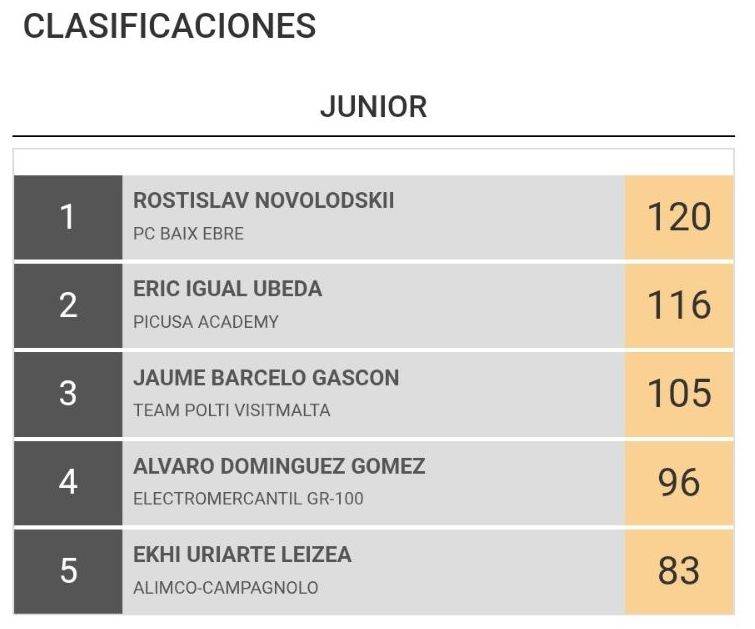 Igual suma 116 puntos por los 120 de Novolodskii, mientras que Asier Fortea (Lucta Granja Rinya), sexto, cuenta con 73 y Óscar Orts (Polti), octavo, 61.