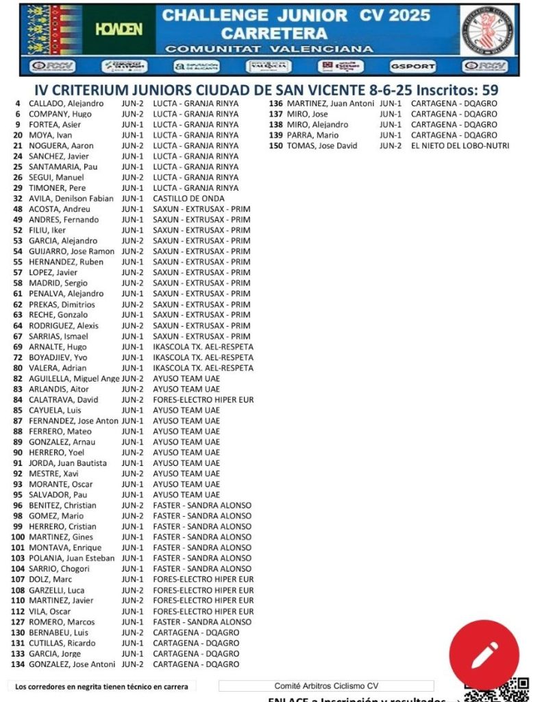 Calendario Challenge Júnior de Ruta de la Comunidad Valenciana