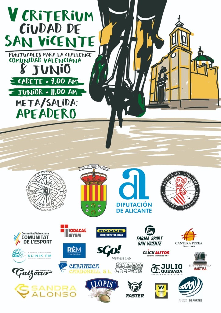 El Club Ciclista San Vicente organiza el domingo, 8 de junio, el V Critérium Ciudad de San Vicente para corredores Cadetes y Juveniles. Ambas pruebas son puntuables para las Challenges de la CV de ambas categorías. Tendrán salida y meta en la Ronda Sur-Apeadero-San Vicente del Raspeig.