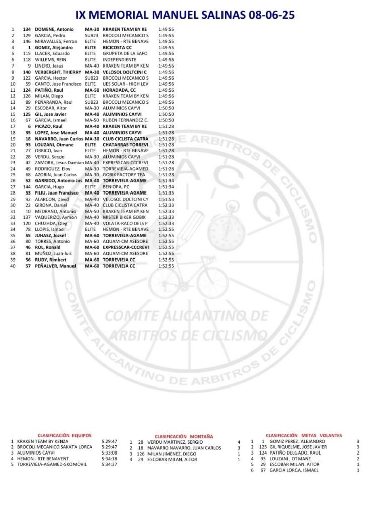 En la General, Aitor Escobar comanda el Torneo por delante de Alejandro Gómiz y Jordi Slootjes. Alejandro Gómiz (Bicicosta) es el mejor élite. El maillot de los jóvenes es propiedad Alfonso Mateo (Catral); Escobar domina entre los M30; Daniel Girona (CC Catral-Telfy) está al frente de la clasificación de los M40; Ismael García (Rubén Fernández), la de los Veteranos; y Ronald Rol, la de los M60. El Kraken Team By Kenza es el mejor equipo y Julio Alberto Amores domina la Montaña y Aitor Escobar, las Metas Volantes.