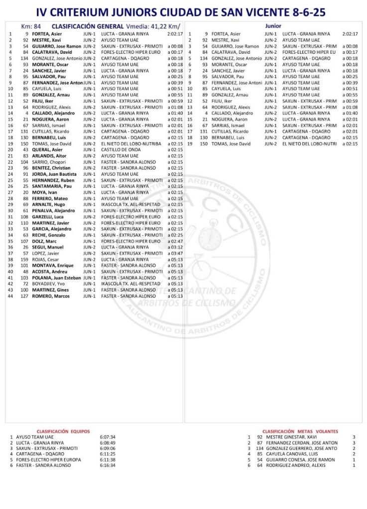 Asier Fortea (Lucta-Granja Rinya) ha sido el ganador del IV Critérium Ciudad de San Vicente Júnior, prueba puntuable para la Challenge de la CV. Xavi Mestre (Ayuso Team) ha entrado segundo y José Ramón Guijarro ha completado el podio. Mestre se ha llevado las Metas Volantes y Ayuso Team ha ganado por escuadras.