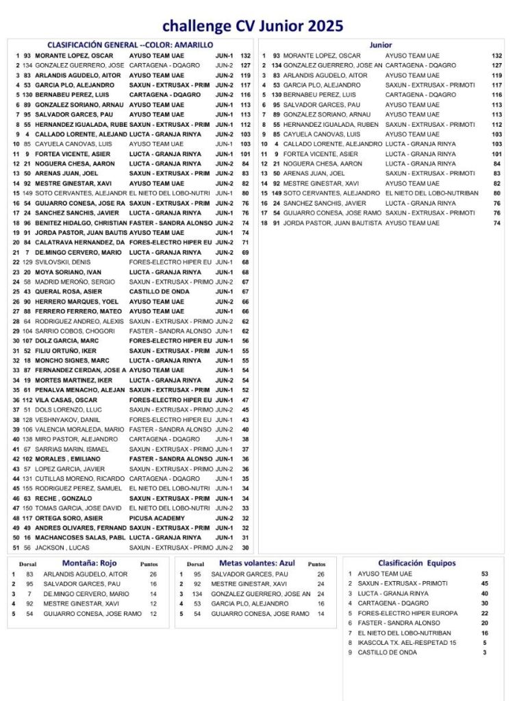 En la General, Óscar Morante (Ayuso Team) es el líder de Torneo. Aitor Arlandis lleva el maillot de la Montaña y Pau Salvador el de las Metas Volantes. El Ayuso Team es el mejor equipo.