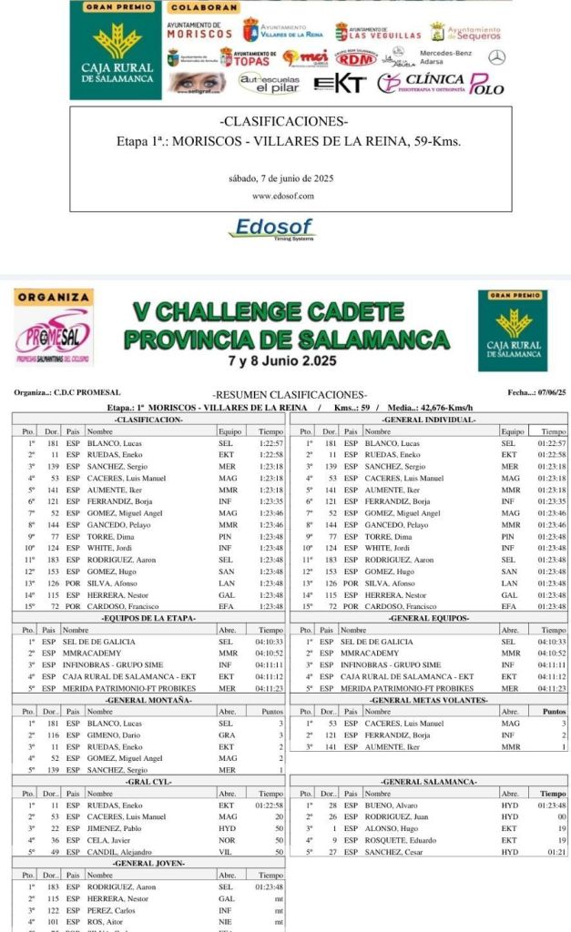 Lucas Blanco (Cambre) ha sido el ganador de la primera etapa de la V Challenge Cadete Provincia de Salamanca que ha partido de Moriscos y ha terminado en Villares de la Reina después de 59 kilómetros de recorrido. Eneko Ruedas (Caja Rural Salamanca) y Sergio Sánchez (Mérida) han completado el podio de la jornada. Destacar la sexta plaza de Borja Ferrándiz (Infinobras Grupo Sime) y la décima de su compañero de equipo Jordi White. Participan en la prueba 200 corredores entre los que figuran 27 equipos españoles y 5 portugueses.