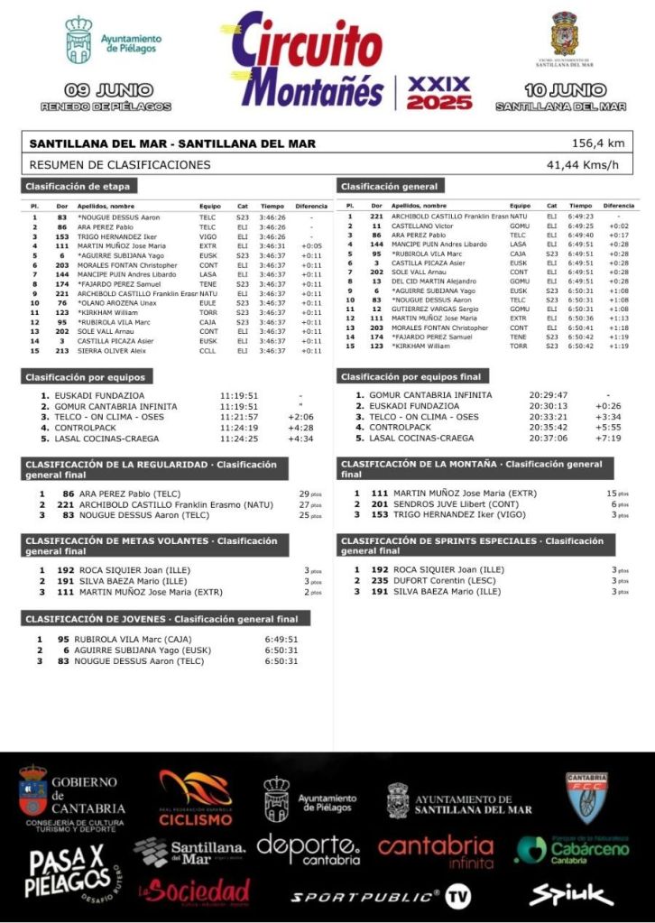 Aaron Nougué (Telco) se lleva la victoria en la etapa final del Circuito Montañés que ha tenido salida y meta en Santillana del Mar y 156,4 kilómetros de recorrido. Franklin Archibold, hoy noveno en meta, ha conquistado para el Natural Greatnes Rali Alé la general. Le han acompañado en el podio Víctor Castellano (Gomur) y Pablo Ara (Telco). Iker Gómez (Finisher), que partió como líder, no ha podido aguantar una jornada muy dura y de batalla sin cuartel desde el banderazo inicial.