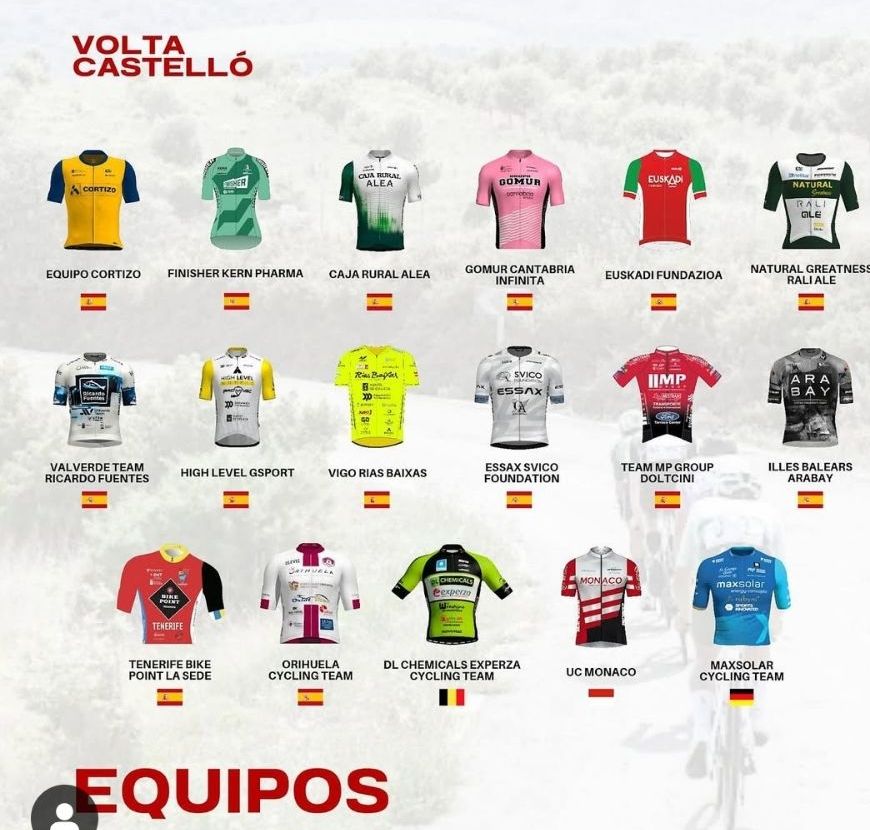 En total serán 17 equipos los que competirán en esta vuelta por etapas que arrancará el jueves y se prolongará hasta el domingo. Y, entre ellas, estarán las estructuras más potentes del panorama español: el Equipo Cortizo, Caja Rural-Alea, Equipo Finisher, Gomur Cantabria Infinita, Valverde Team Ricardo Fuentes, Natural Greatness Rali Alé, High Level Gsport, Vigo Rias Baixas, Essax Svico Foundation, Team MP GroupDoltcini, Illes Balears Arabay, Euskadi Fundazioa, Orihuela Cycling Team y Tenerife Bike Point La Sede. Además participarán formaciones internacionales de gran renombre como el UC Monaco, el MaxSolarCyclingTeam y el DL Chemicals-ExperzaCyclingTeam. Todos ellos buscarán hacerse con el maillot amarillo de líder en una carrera marcada por la exigencia del recorrido y la belleza del territorio castellonense.
