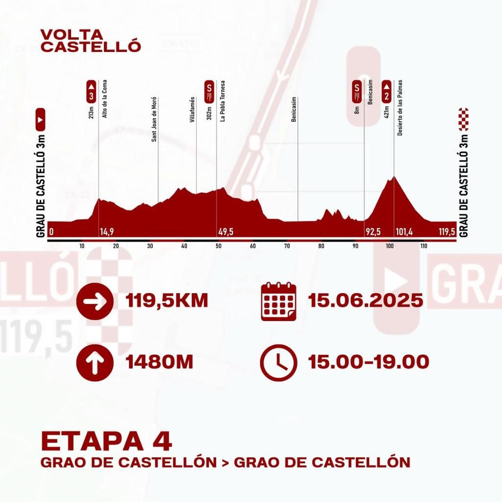 La cuarta y última etapa de la Volta Castelló es la oportunidad perfecta para buscar la gloria con un ataque final o recortar el tiempo en la CG perdido en el día de hoy. El Desierto de las Palmas será el último juez de la edición antes de finalizar en Grao de Castellón, donde por la mañana se dará también la salida. La jornada arrancará a las 10:00 y terminará sobre las 12:30 horas.