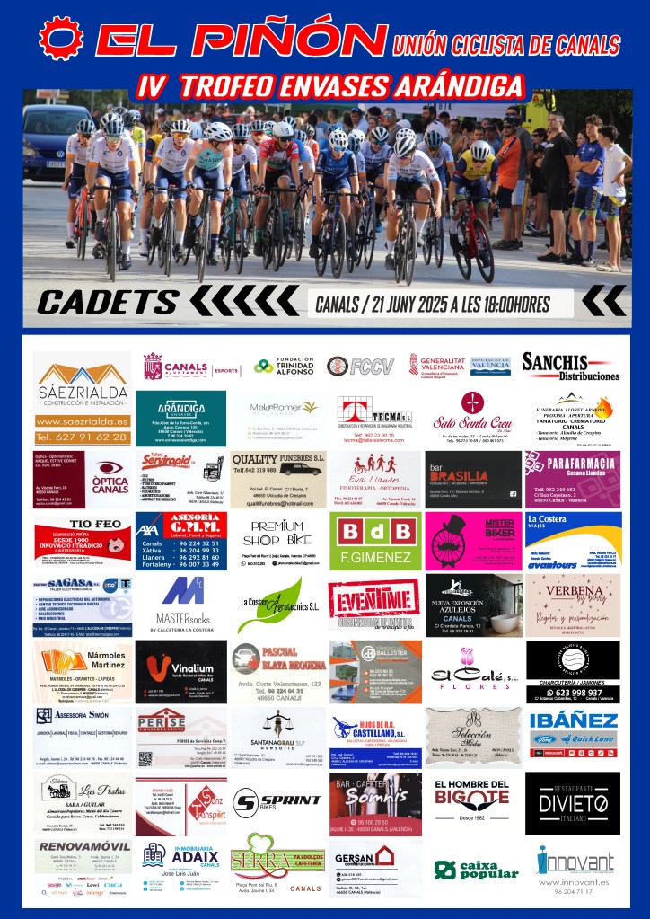 El sábado, día 21 de junio, se disputa en Canals el IV Trofeo Envases Arándiga de Cadetes. La prueba comenzará a las 18 horas. El pelotón completará 19 vueltas a un circuito de 3,2 kilómetros hasta sumar los 60 previstos por la Unión Ciclista de Canals, organizador de la competición.
