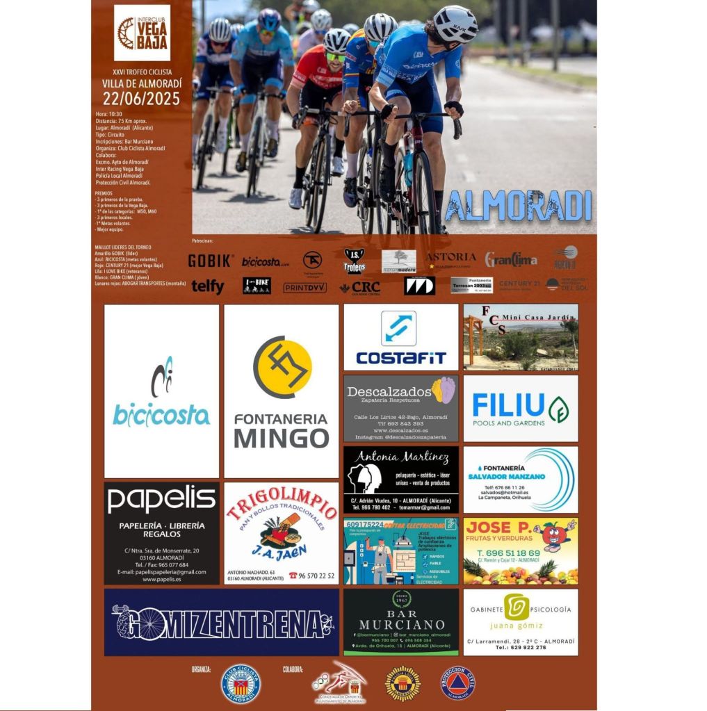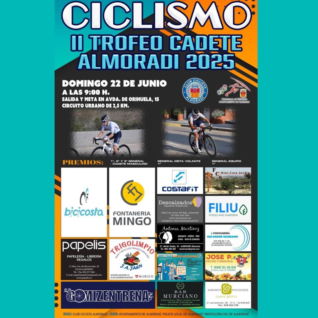 El próximo domingo 22 de junio Almoradí tiene una doble cita con el mejor ciclismo en Almoradí. A partir de las nueve de la mañana se celebra el II Trofeo Cadete Almoradí 2025, y, a continuación, a las 10.30 horas, el XXVI Trofeo Ciclista Villa de Almoradí puntuable para Interclub Vega Baja.
