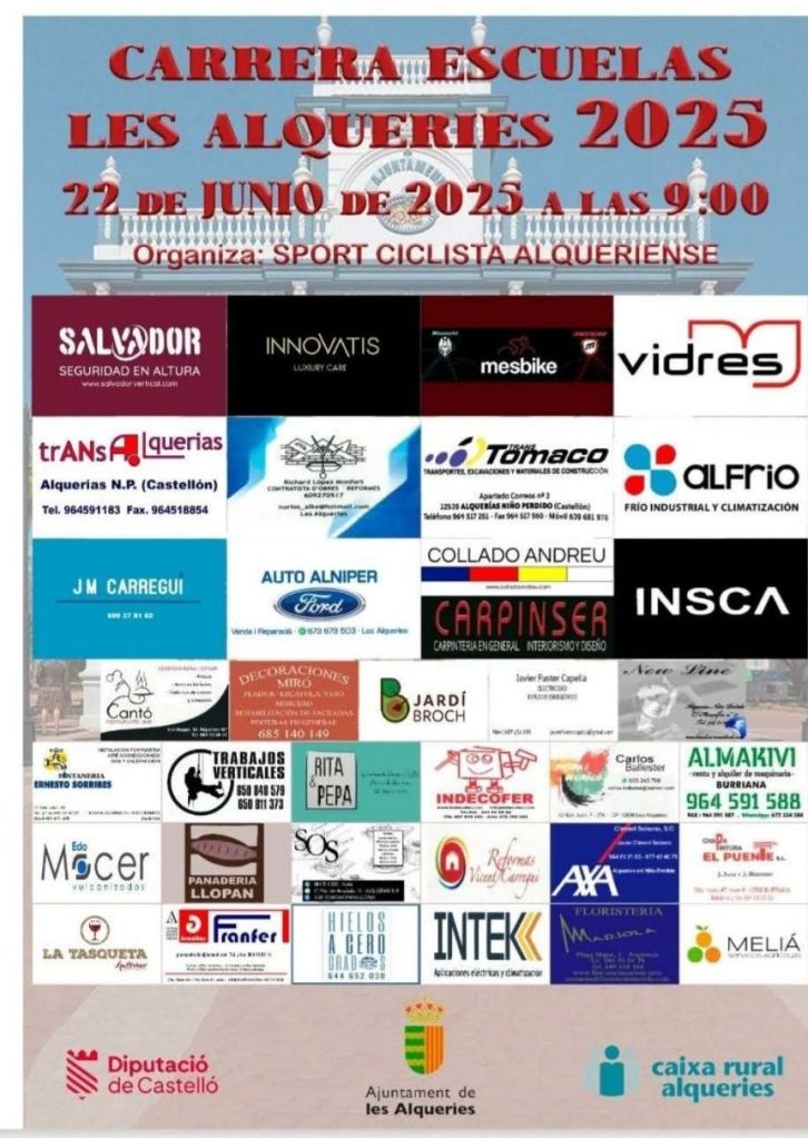 Hoy domingo, 22 de junio, tendrá lugar la Carrera de Escuelas Les Alqueríes, a partir de las 9 horas, puntuable para la Challenge de Escuela de Castellón. Organiza el Sport Ciclista Alqueriense.