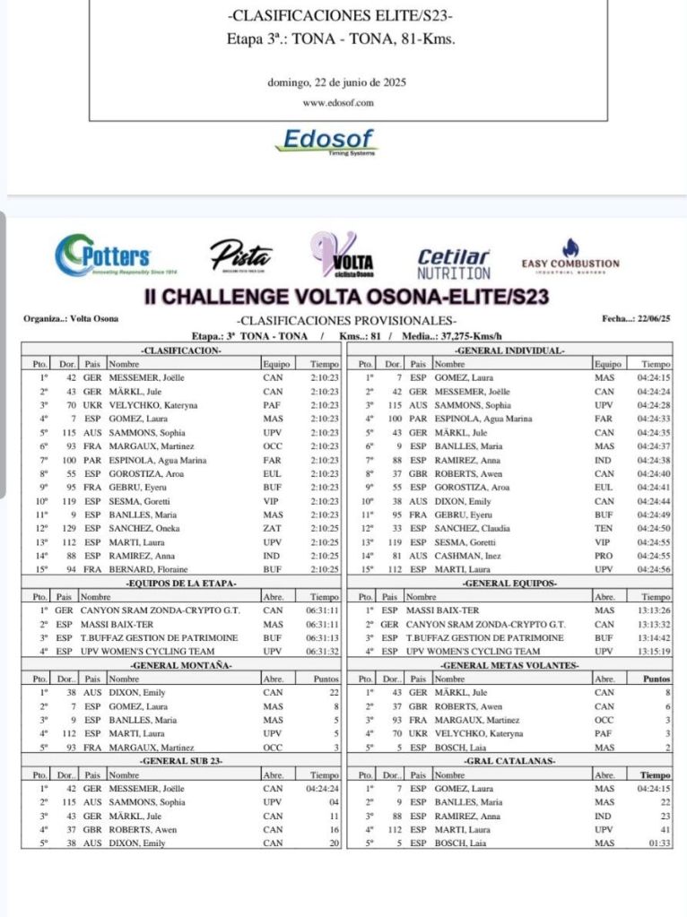 Y en Élite y Sub23, Joëlle Messemer (Cayon) ha sido la vencedora en Tona y Laura Gómez (Massi) se ha llevado la general.