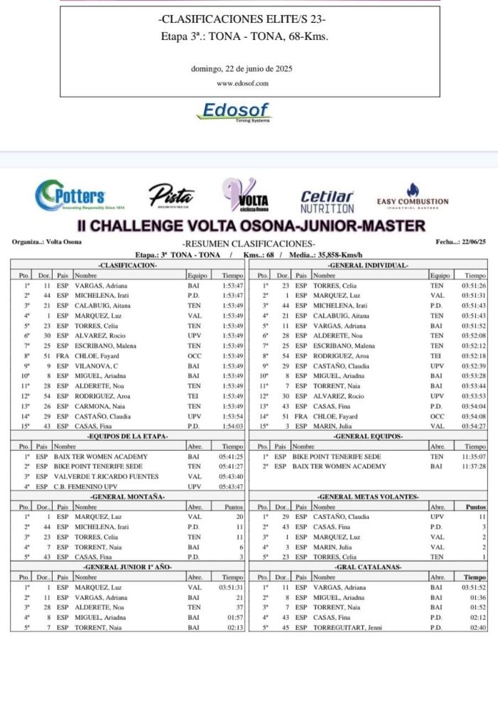 En la categoría Júnior, triunfo en la última jornada de Adriana Vargas (Baix Ter) por delante de Irati Michelena (P.D.) y de Aitana Calabuig (Tenerife). Celia Torres (Tenerife) ha sido la vencedora de la general. Cuarta Calabuig y sexta Noa Alderete. Claudia Castaño (Ciclismo Base Femenino UPV Ciclismo) se ha adjudicado las MV de las Júniors.