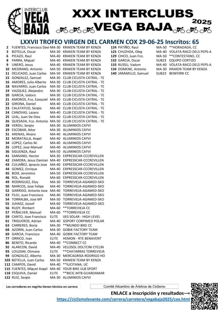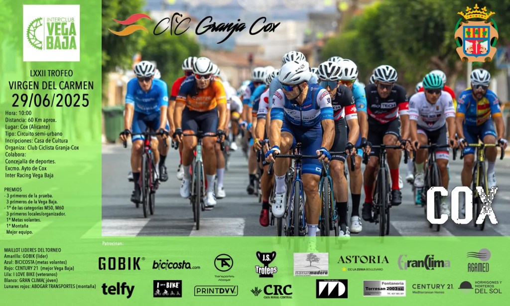 El LXXII Trofeo Virgen del Carmen despide el domingo, día 29 de junio, en Cox, el Interclub Vega Baja. La prueba comenzará a las 10 horas. Un total de 60 kilómetros, en un circuito semiurbano, esperan al pelotón. Con salida y llegada en la puerta de la Casa de Cultura, el Club Ciclistas Granja-Cox ha diseñado un circuito. Se darán 15 pasos por meta y donde en esta carrera se puntúa doble al ser la final del Torneo.