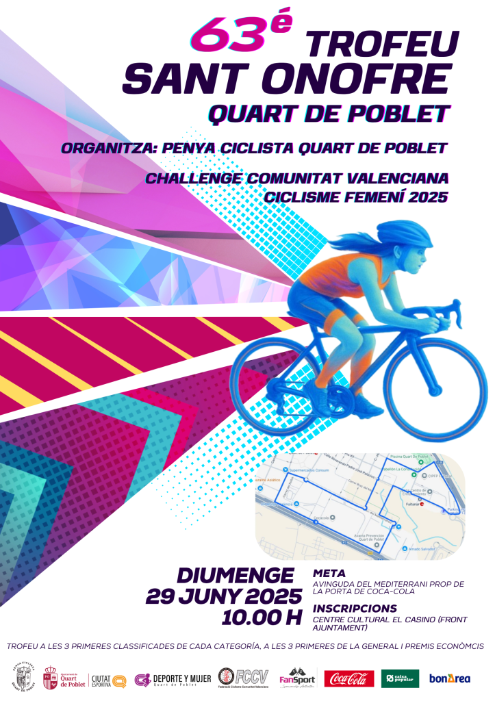 Rocafort y Quart de Poblet viven este fin de semana dos prueba de la Challenge de la CV de Ciclismo Femenino. El sábado, a partir de las 16.30 horas, comenzará el I Trofeo Carrera Ciclista Femenina Rocafort. Ya, el domingo, tendrá lugar el 63 Trofeu Sant Onofre en Quart de Poblet. La salida será a las 10 horas.