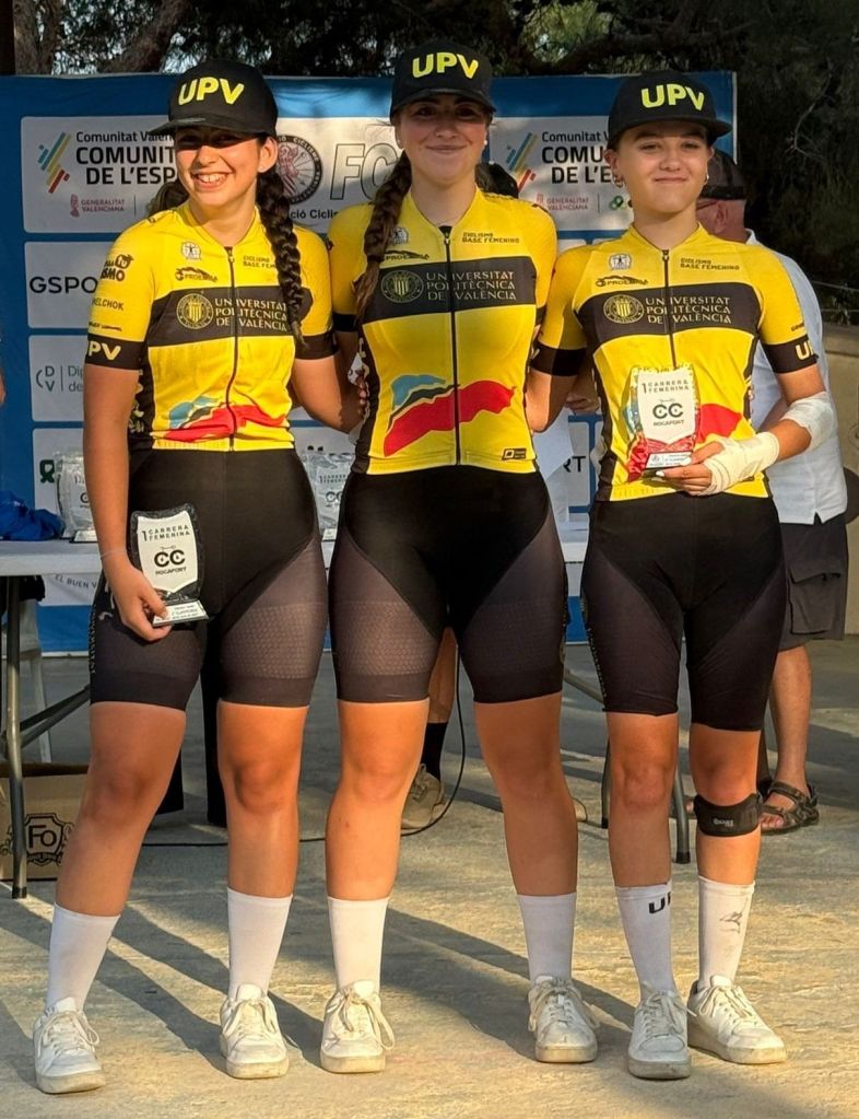 Sofía Roig (Ciclismo Base femenino UPV) ha ganado en júnior por delante de sus compañeras de equipo Aroa Villarroya y Nerea Bermúdez.