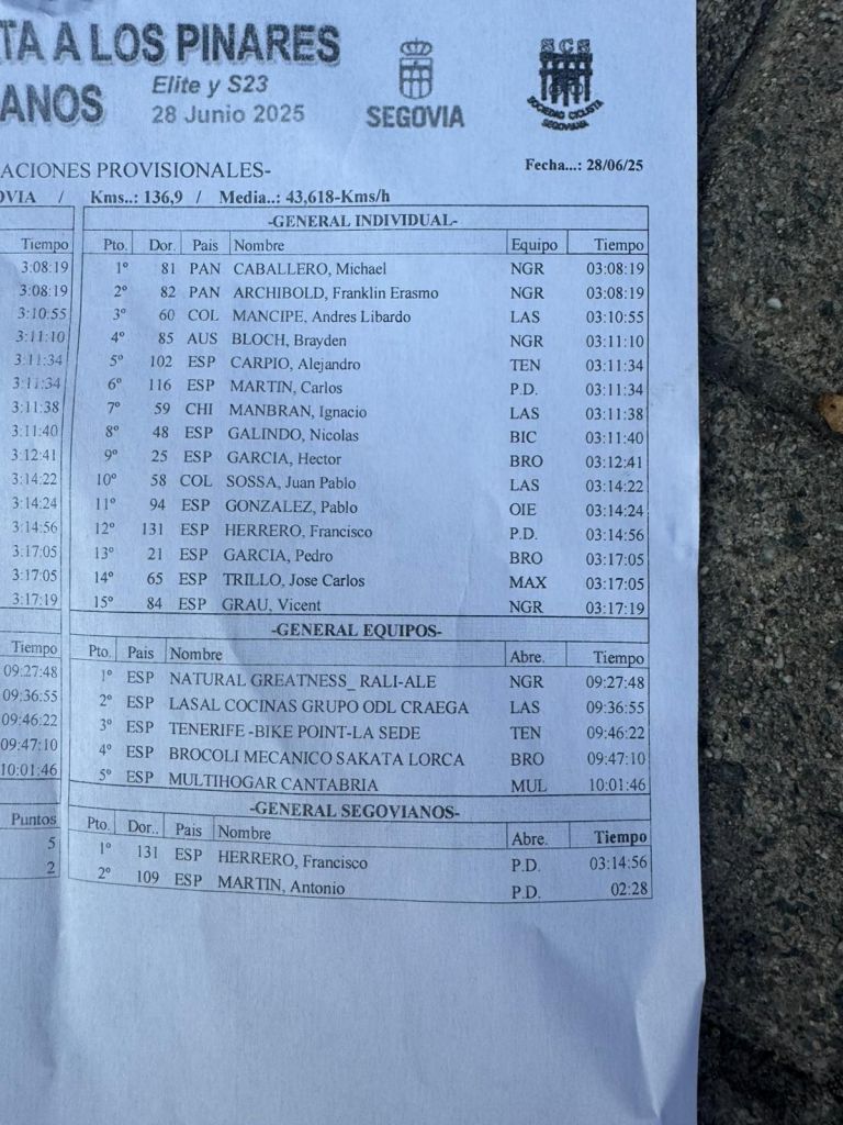 El equipo Natural Greatness Rali Alé ha dominado hoy en la XLI VUELTA PINARES SEGOVIANOS-XXII MEMORIAL FÉLIX MERINO. Michael Caballero ha dado el triunfo al equipo élite y sub 23 de la Fundación Benicadell. Su compañero Franklin Archibold ha entrado a su lado segundo y Andrés Libardo Mancipe (Louriña) ha completado el podio. Por escuadras se ha impuesto en Natural Greatness.