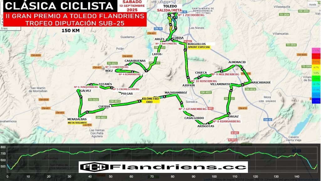 La segunda edición del Gran Premio Ciclista a Toledo Flandriens, que se disputa el 13 de septiembre, viene cargada de novedades y mucha emoción para disfrutar de lo mejor del ciclismo Sub25. La carrera no solo desafiará a los corredores, que ya llegan con bastante carga tras estar viviendo una temporada intensa, sino que también cautivará a los espectadores con su impresionante recorrido. A lo largo del mismo, se encontrarán con más de 20 poblaciones diferentes (como si de una vuelta por etapas se tratara), sumando un total de 150 kilómetros de pura adrenalina, siendo esta carrera un homenaje a la resistencia y la pasión por el ciclismo.