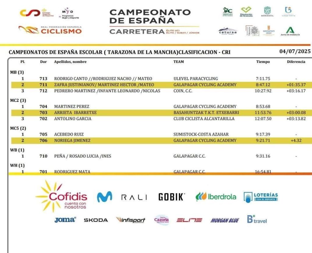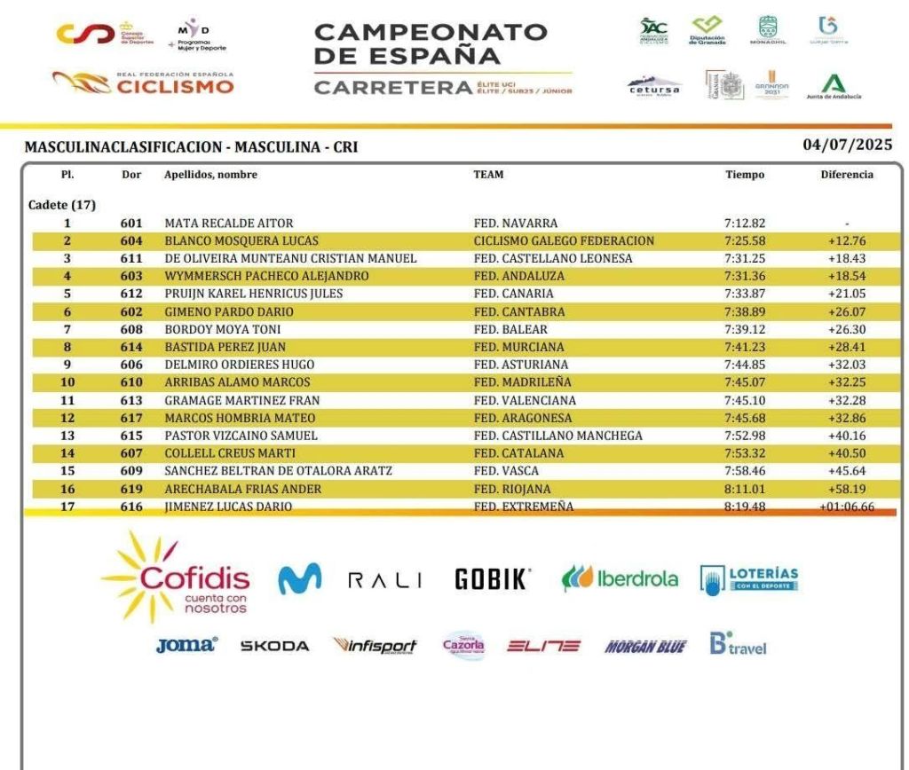 En la categoría masculina, el navarro Aitor Mata se ha primera campeón de España cadete CRI. Lucas Blanco (Galicia) y Manuel de Oliveira (Castilla y León) han completado el podio.