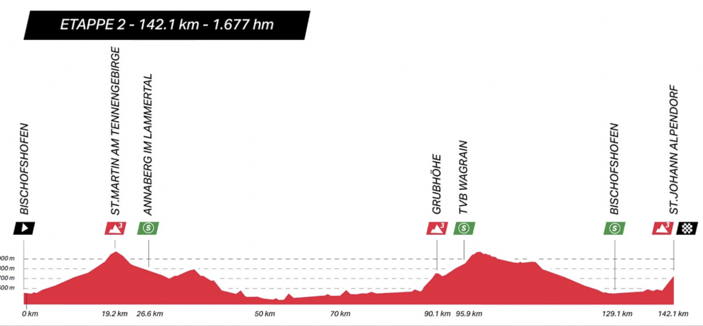 - Etapa 2 (10 julio): Bischofshofen → Salzburgo, 142,1 km, 1 676 m