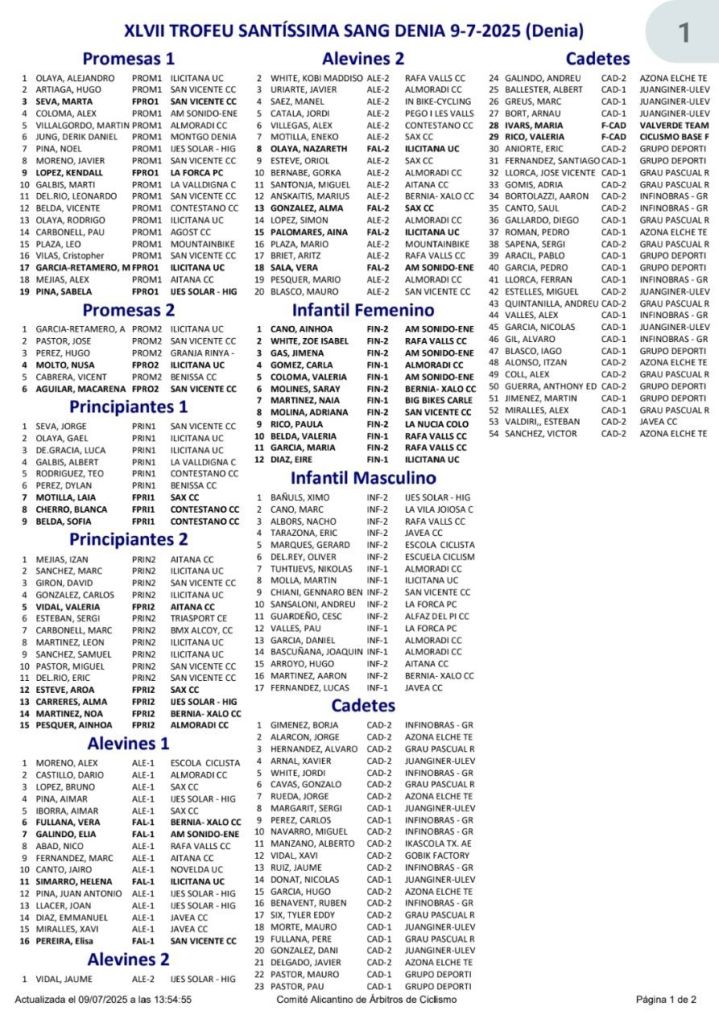 En Infantil 1, triunfos de Carla Gómez (Almoradí) y Nicolás Tuhtijevs; de Alejandro Olaya (UC Ilicitana) y Marta Seva (San Vicente), en Promesas 1; de Adrián García-Retamero (UC Ilicitana) y Nusa Moltó (UC Ilicitana), en Promesas 2; de Jorge Seva (San Vicente) y Laia Motilla (Sax), en Principiantes 1; de Izán Mejías (Aitana) y Valeria Vidal (Aitana), en Principiantes 2; de Álex Moreno (Pinedo) y Vera Fullana (Bernia), en Alevines 1; y de Jaume Vidal (Ijes Solar-High Level Gsport) y de Nazareth Olaya (UC Ilicitana), en Alevines 2.