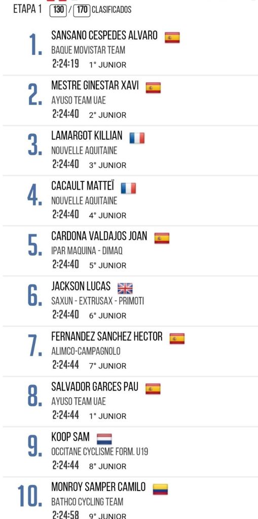Álvaro Sansano (Baqué) se ha impuesto en Markina-Xemein en la primera etapa de la Bizkaia Itzulia Júnior y se ha vestido de líder. Sansano ha entrado en solitario en meta. Xavi Mestre (Ayuso Team UAE) ha entrado segundo y Kilian Lamargot (Nouvelle Aquitaine), tercera. Lucas Jackson (Saxun Extrusax-Primoti) acaba sexto y Pau Salvador (Ayuso Team UAE) finaliza octavo y primer joven. El Ayuso Team es el segundo mejor escuadra y Sansano domina también la clasificación de la Montaña. Buena carrera de los ciclistas de la Comunidad.