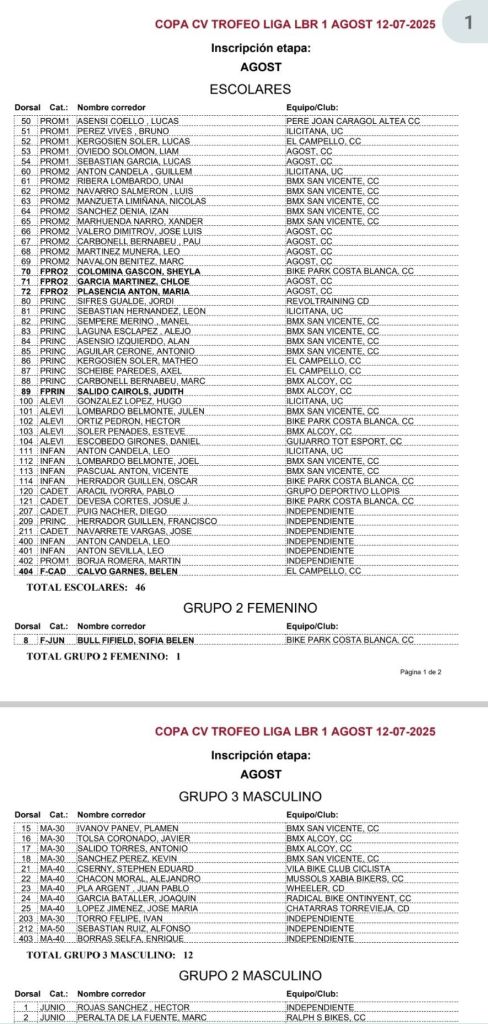 - Categorías: Sub23 Fem., Sub23, Promesas Masculino, Promesas Femenino, Promesas de 5 y 6 años, Principiantes Femenino, Principiantes de 9 y 10 años, Master 60 Fem., Master 60, Master 50 Fem., Master 50, Master 40 Fem., Master 40, Master 30 Fem., Master 30, Junior Fem., Junior, Infantiles de 13 y 14 años, Infantil Femenino, Elite Fem., Elite, Cadete Fem., Cadete, Alevines de 11 y 12 años, Alevin Femenino