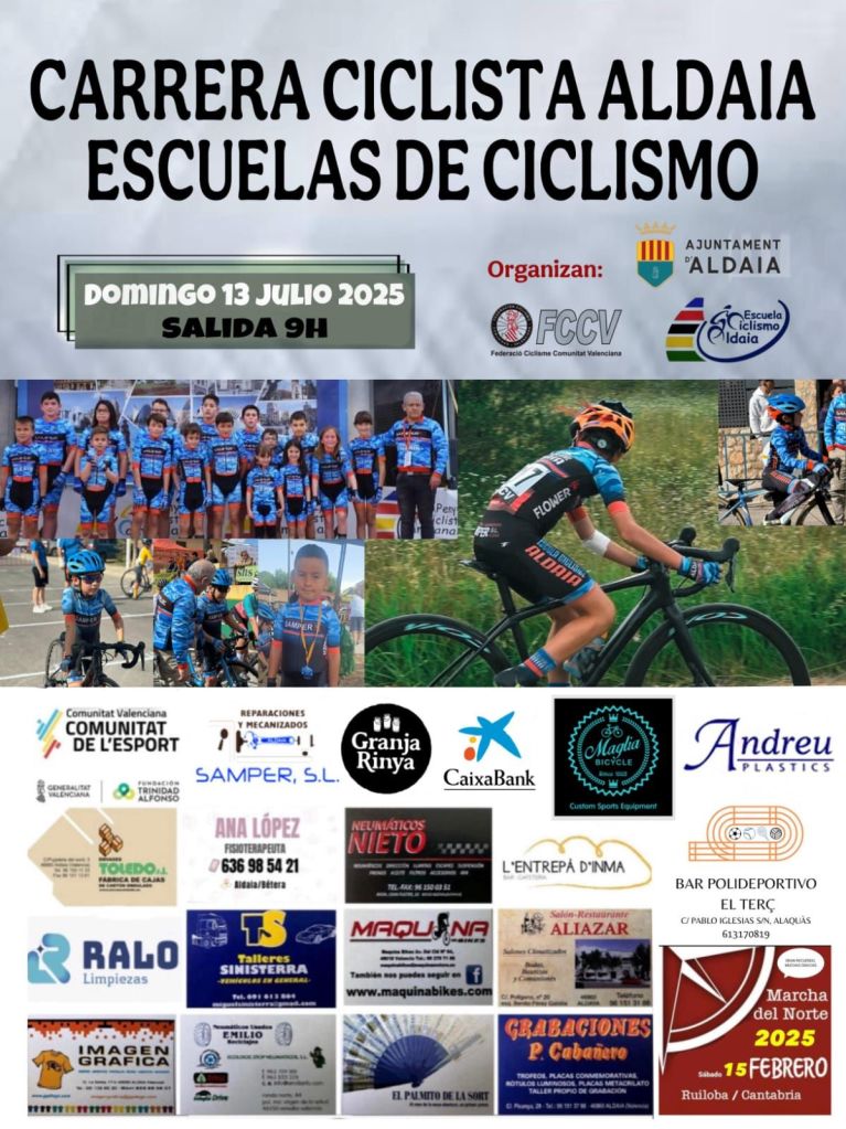 El domingo, 13 de julio, doble cita para los más pequeños. Se disputa la Carrera Ciclista Aldaia-Escuelas de Ciclismo y la Reunió Escoles de Ciclismo-Trofeo Orbel en Almassora. Ambas comienzan a las 9 horas.