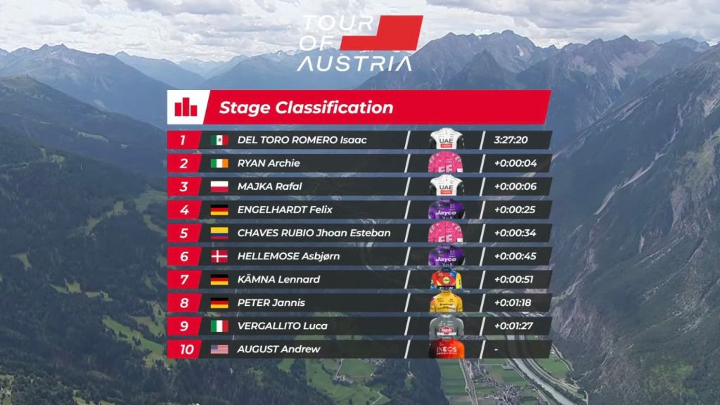 Héctor Álvarez, junto a Baroncini, Costa, Dodd, Double, Fetter, Goagl, Huyet, Puccio, Primožič, Stensby y Stüssi se metieron en la escapada del día. La cabeza de carrera se vio reducida a un trío antes de la primera subida a la estación de esquí de Kühtai, esta vertiente tenía preparados 22,9 km al 6% de desnivel y fue coronada por Rui Costa (EF), Paul Double (Jayco) y Colin Stüssi (Vorarlberg). La etapa marchaba con un pelotón que mantenía una diferencia alrededor del minuto con la escapa, mientras que por arriba, el portugués de EF Education se quedó solo antes de la última ascensión del día, Ötztal Sattele (9,7 km al 10,3%). Un paso previo al Kühtai, que, esta vez, sería más corto: 5,8 km al 7%. Coon Costa absorbido en el inicio de la doble escalada final, Chaves, Hellemose y Majka conformaron otro terceto cabecero; distanciándose rápidamente del pelotón controlado por UAE por detrás. El conjunto del líder controló y dispuso para afianzar, más aún, la clasificación general con Isaac del Toro. El mexicano se movió a la perfección junto a Lennard Kämna y Archie Ryan. No le aguantaron y, finalmente, Del Toro logró su tercera victoria de etapa y se vestía de líder.